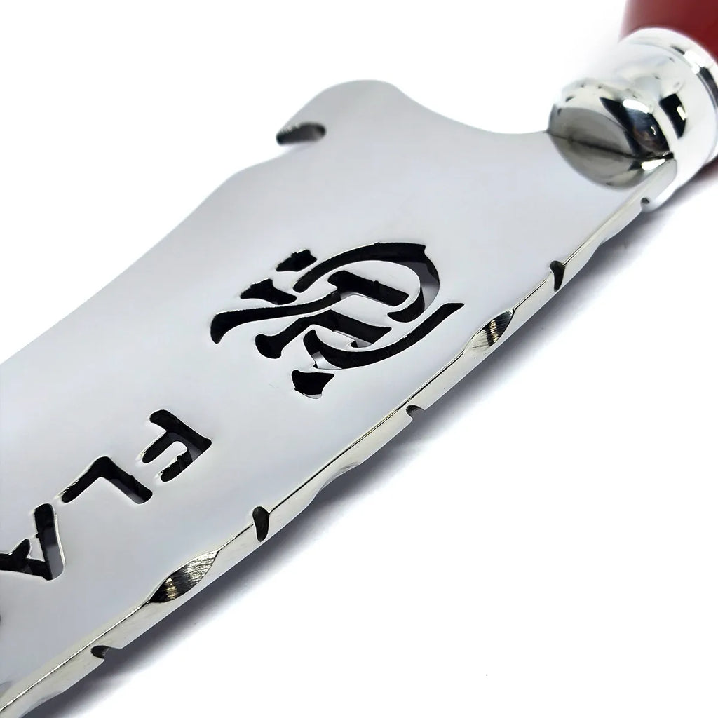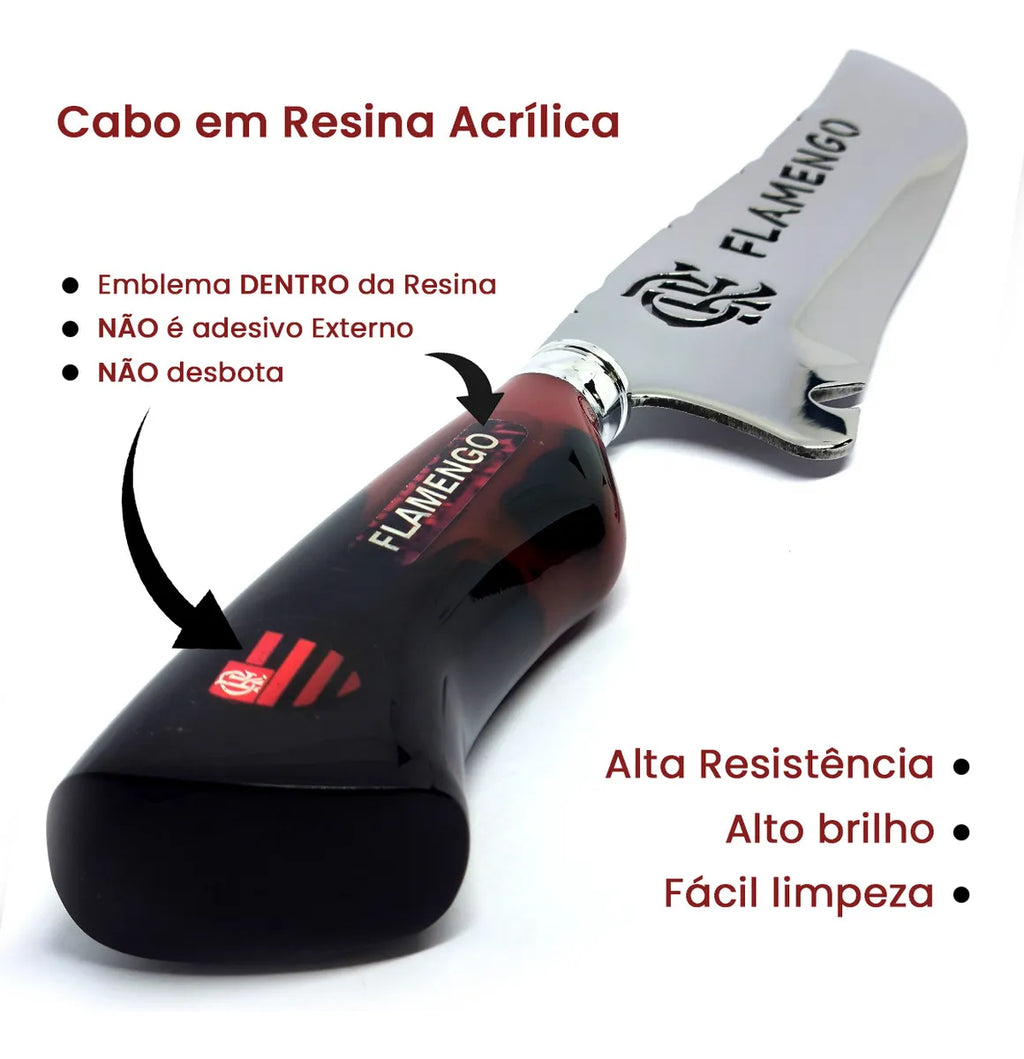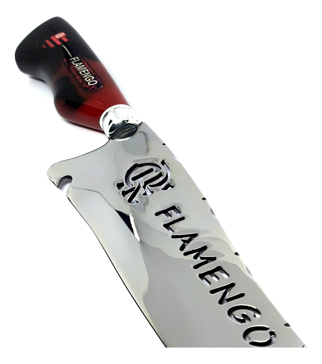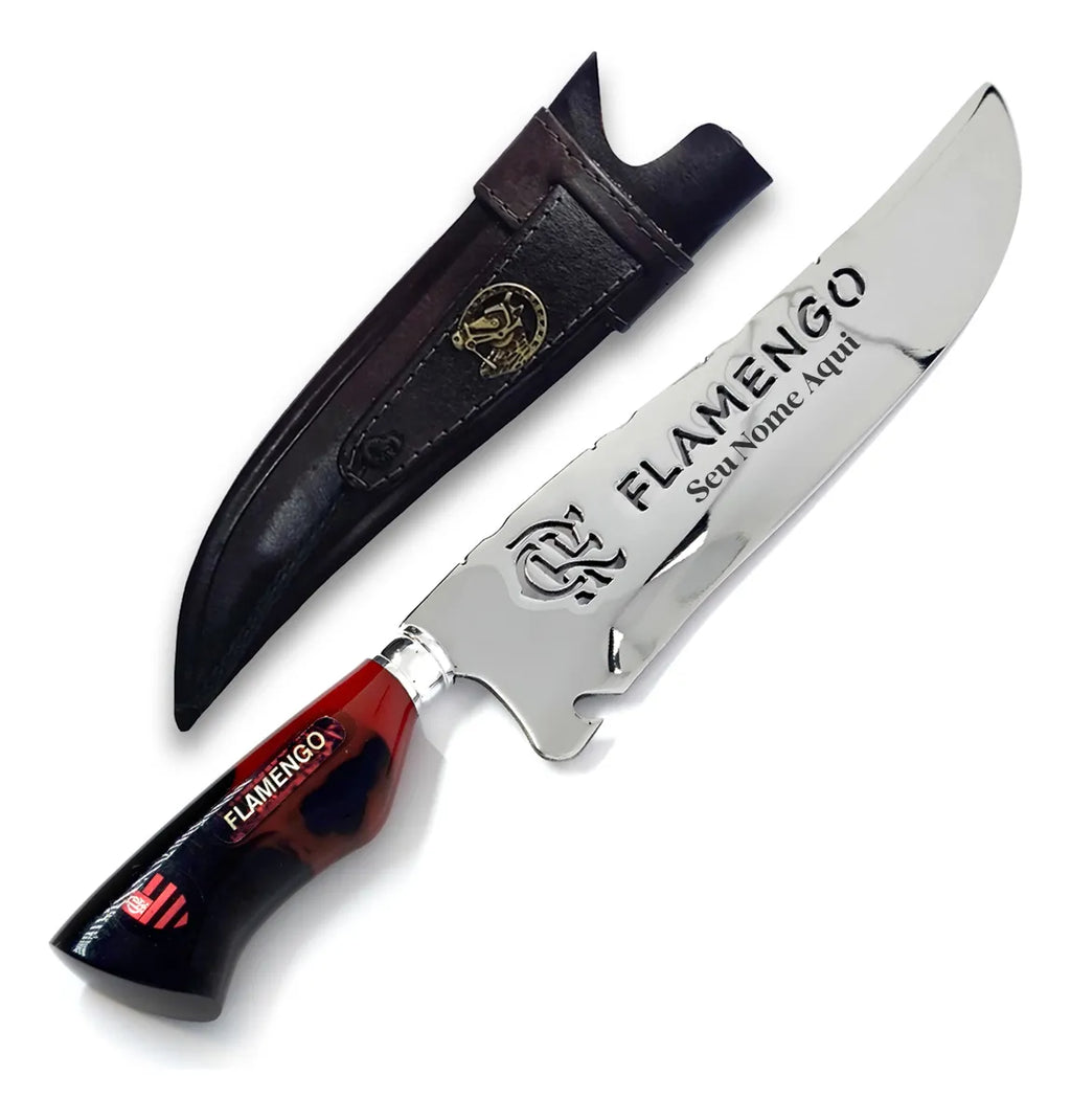 Faca artesanal exclusiva com logotipo vazado do clube na lâmina e gravação personalizada com nome. Um item robusto, imponente e ideal para colecionadores, churrasco ou uso diário.