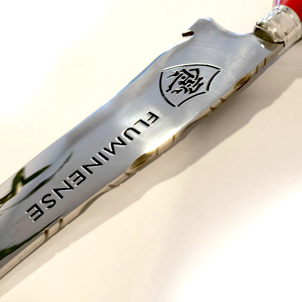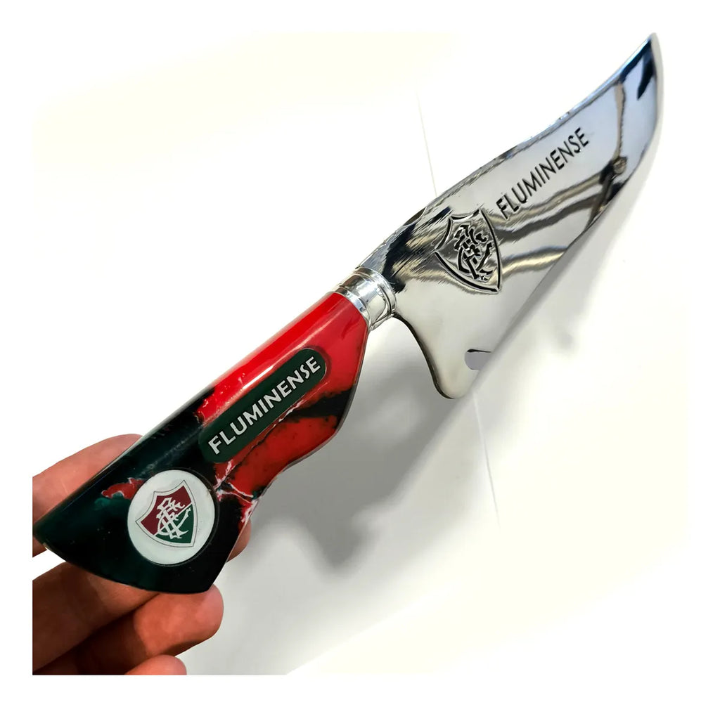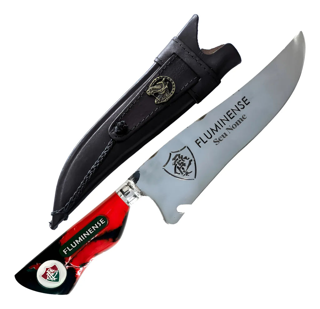 Faca artesanal exclusiva com logotipo vazado do clube na lâmina e gravação personalizada com nome, ideal para fãs de futebol que valorizam qualidade, estilo e durabilidade.