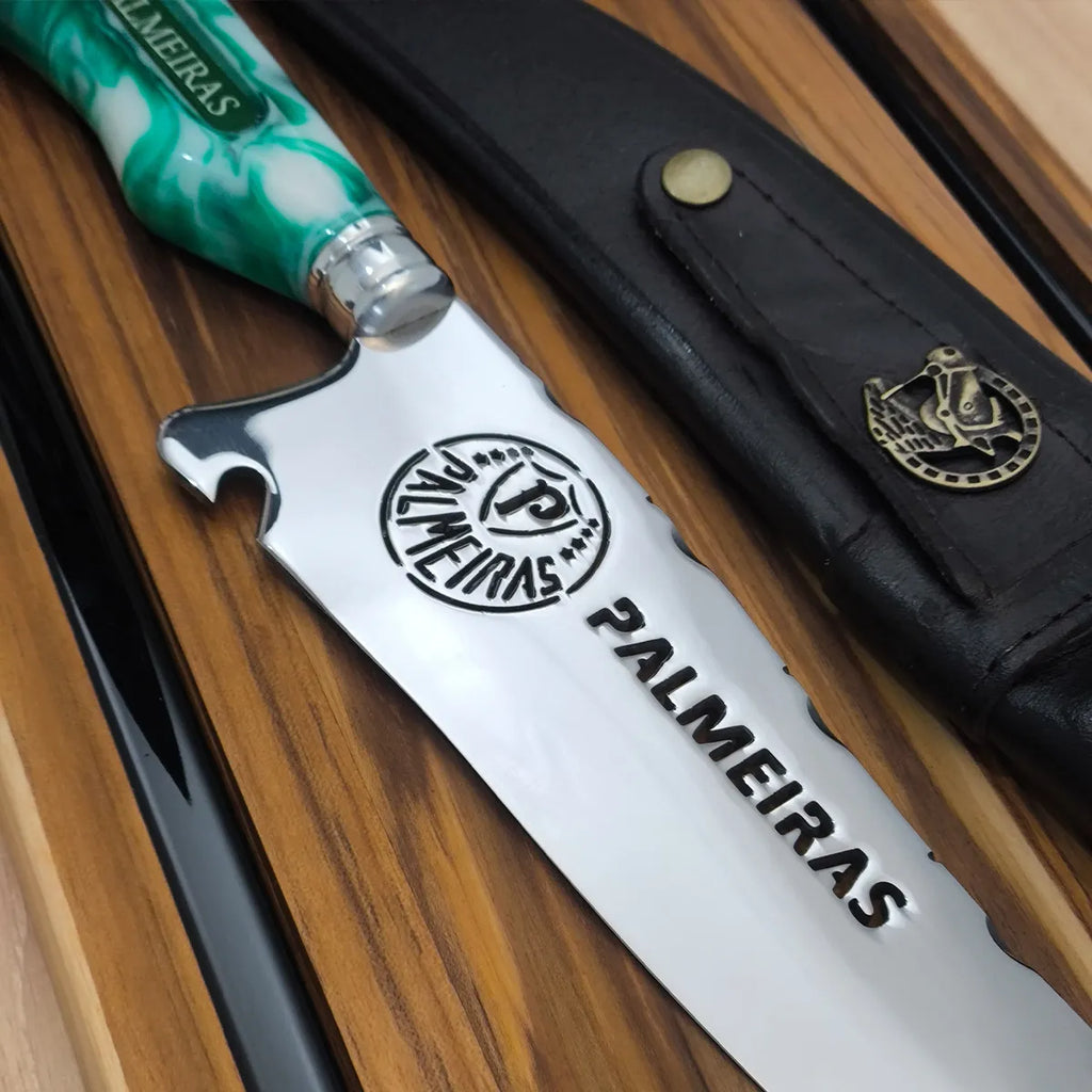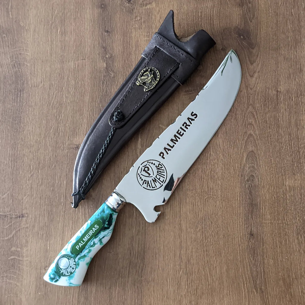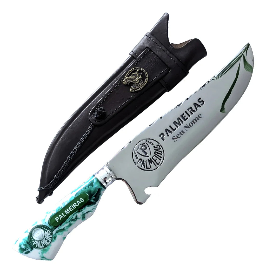 Faca artesanal exclusiva com logotipo vazado do clube na lâmina e gravação personalizada com nome, ideal para apaixonados por futebol que buscam um produto robusto, durável e diferenciado.