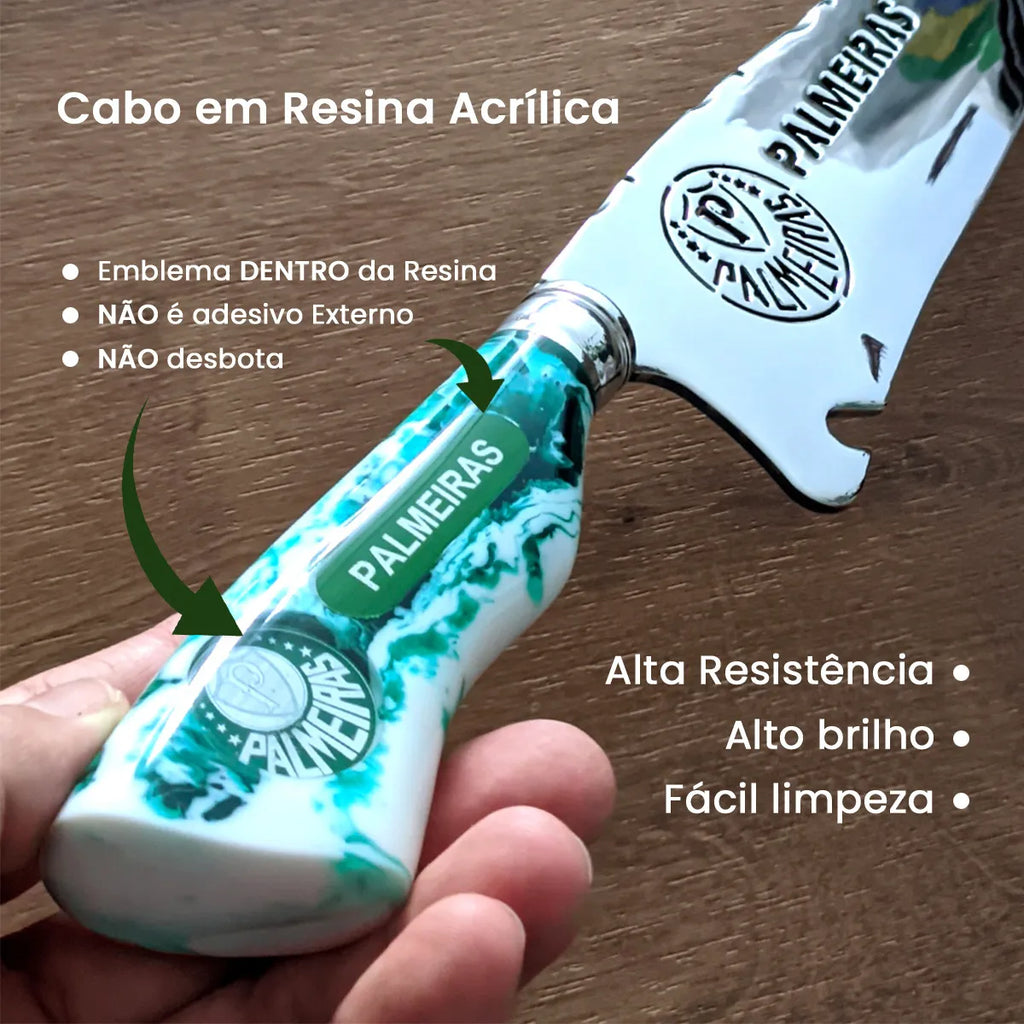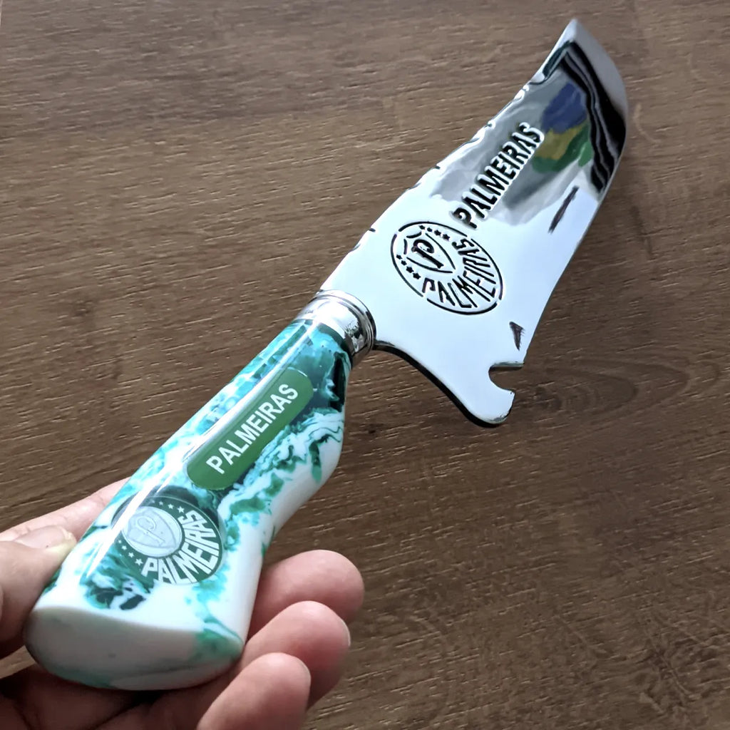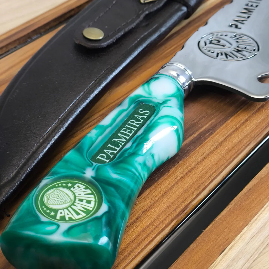 Faca artesanal exclusiva com logotipo vazado do clube na lâmina e gravação personalizada com nome, ideal para apaixonados por futebol que buscam um produto robusto, durável e diferenciado.